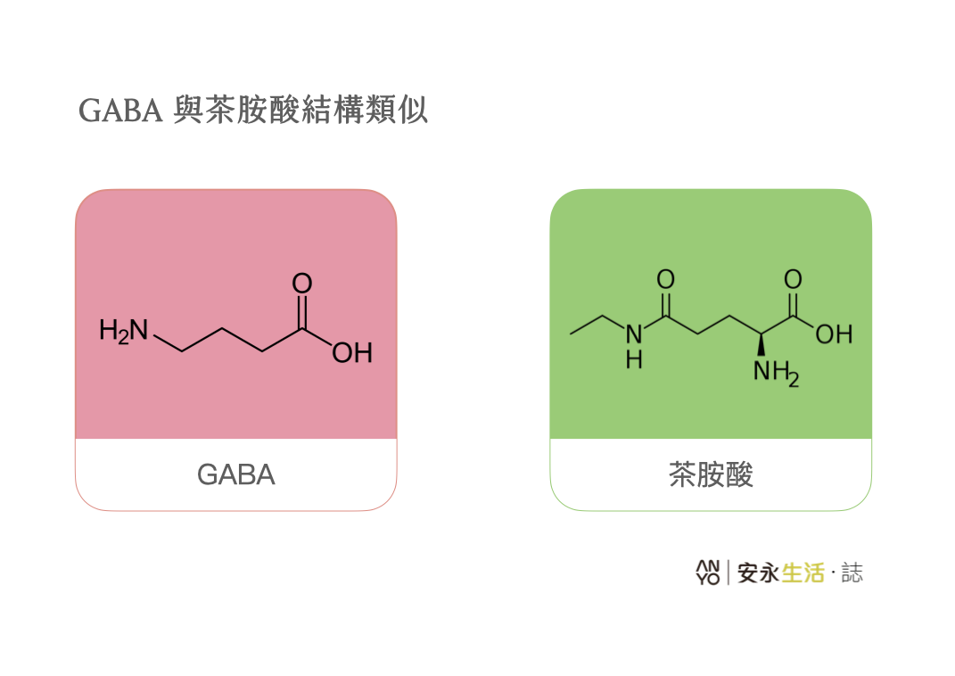 茶胺酸跟 GABA 很像,那有多像呢?可以看看下圖的結構;也因此有類似的作用也是很合理的事情,也就是說,茶胺酸也有放鬆的能力,不過別擔心,它沒有鎮靜的效果,吃了不會讓人嗜睡。有趣的是,一開始的時候,茶胺酸通常是跟著咖啡因和其他茶的活性成分一起飲用,因此早先,大部分有關情緒和認知功能的研究都是這些成分結合的結果,讓它被埋沒了許久,後來分開來看,才發現這個成分可能被埋沒了。